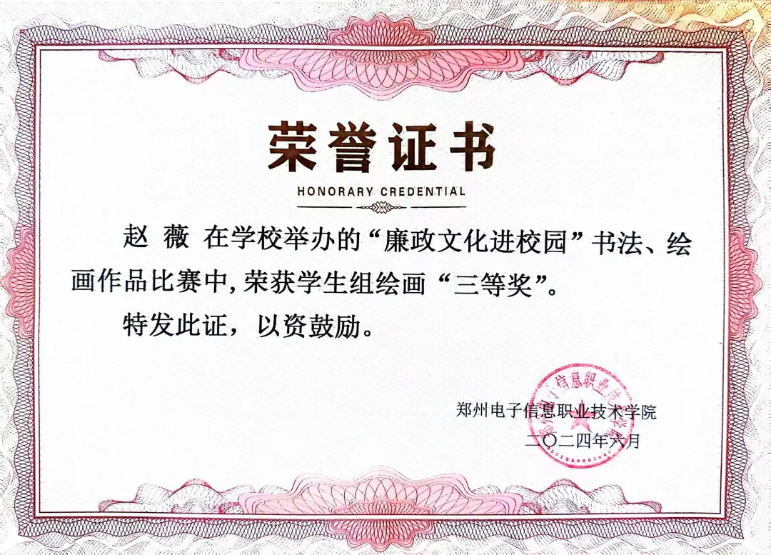 信息工程學(xué)院積極參加此次比賽并取得了優(yōu)異的成績(jī),“廉政文化進(jìn)校園”書法競(jìng)賽,馬雪陽老師榮獲教師組書法“二等獎(jiǎng)”,張鵬飛同學(xué)榮獲學(xué)生組書法“二等獎(jiǎng)”,“廉政文化進(jìn)校園”繪畫作品競(jìng)賽,趙薇同學(xué)榮獲學(xué)生組繪畫“三等獎(jiǎng)”,馮彥燕老師在“建設(shè)清廉學(xué)校、弘揚(yáng)清廉風(fēng)韻”征文大賽中榮獲“三等獎(jiǎng)”。