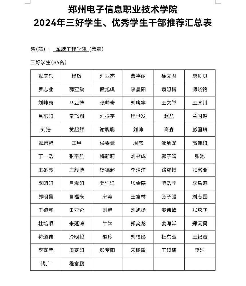 為提高學(xué)生綜合素質(zhì),樹立典型,激勵(lì)學(xué)生勤奮學(xué)習(xí)、健康成長(zhǎng),我院根據(jù)《鄭州電子信息職業(yè)技術(shù)學(xué)院關(guān)于評(píng)選三好學(xué)生、優(yōu)秀學(xué)生干部、先進(jìn)班集體的通知》(鄭電院【2024】038號(hào))文件要求開展2024年度校級(jí)三好學(xué)生、優(yōu)秀學(xué)生干部、先進(jìn)班集體的評(píng)選工作,依據(jù)評(píng)審條件和要求,車輛工程學(xué)院內(nèi)遵循公正、公平、公開的原則經(jīng)個(gè)人推薦、班級(jí)評(píng)選、學(xué)院評(píng)審小組審核,擬推薦三好學(xué)生86名,優(yōu)秀學(xué)生干部34名,先進(jìn)班集體4個(gè)。名單公示如下: